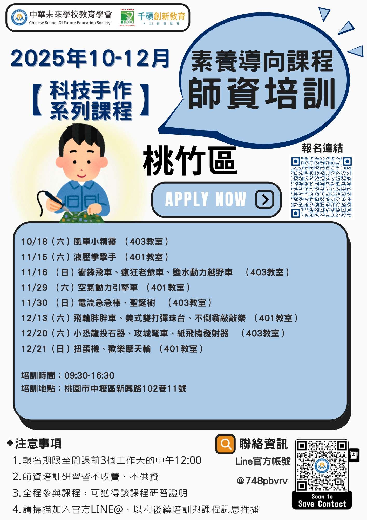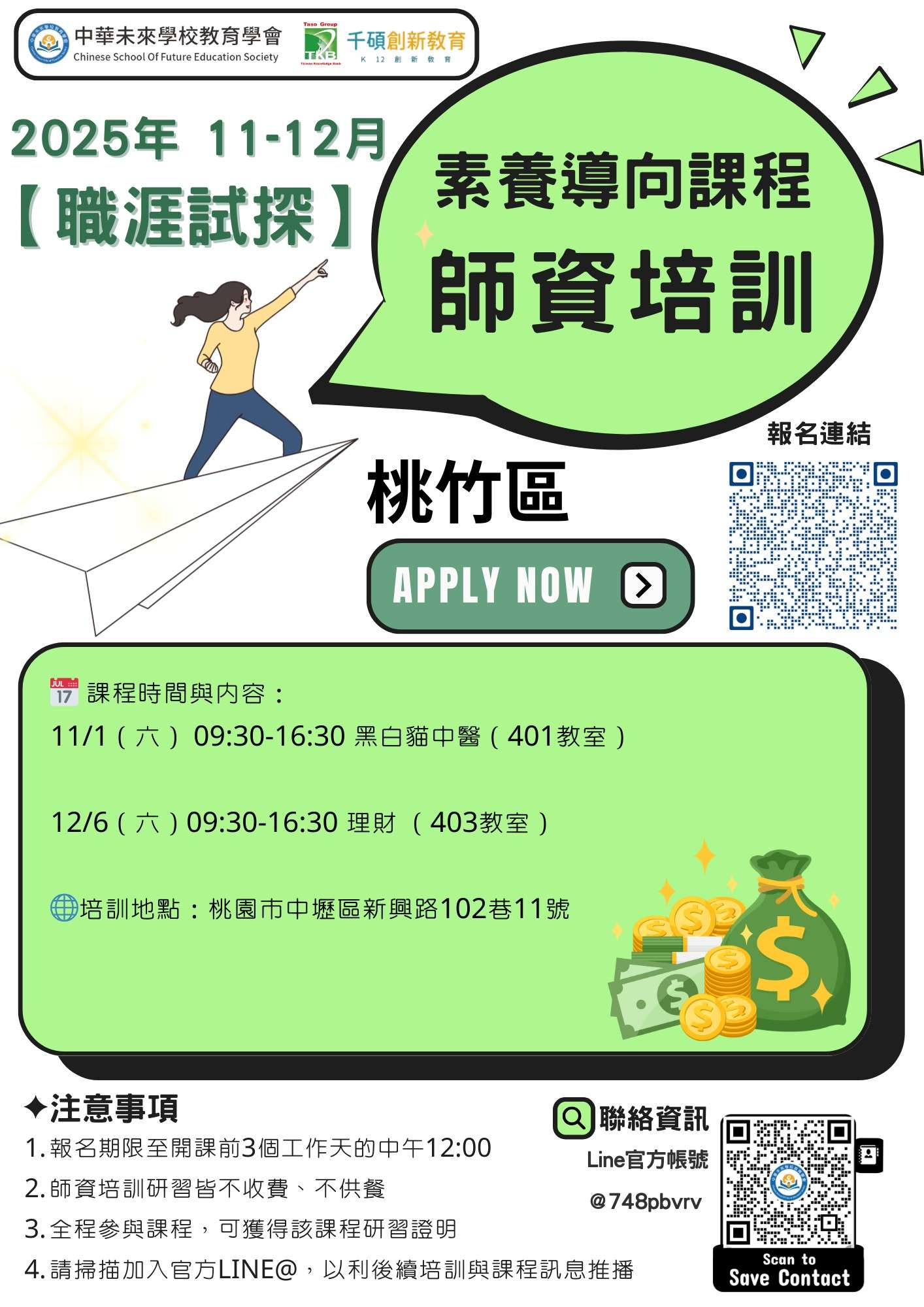 二、 | 本系列研習規劃培訓領域,包含職涯試探領域:中醫、理財,科技素養領域:科技手作,以協助教師精進多元素養教學能力,並拓展教學應用成效,詳見海報資訊。 |