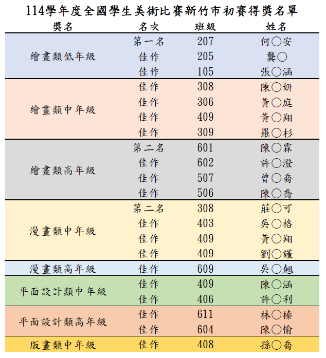 114學年度全國學生美術比賽新竹市初賽得獎名單