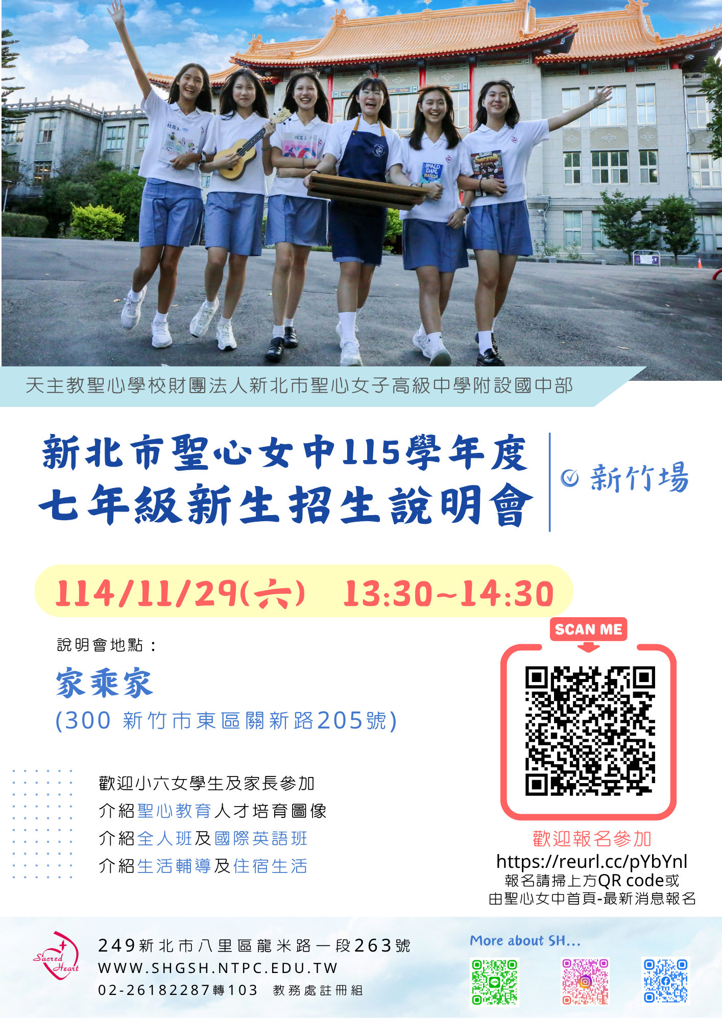 (二)    聖心女中首頁www.shgsh.ntpc.edu.tw—最新消息--115學年度七年級新生招生說明會(新竹場)
