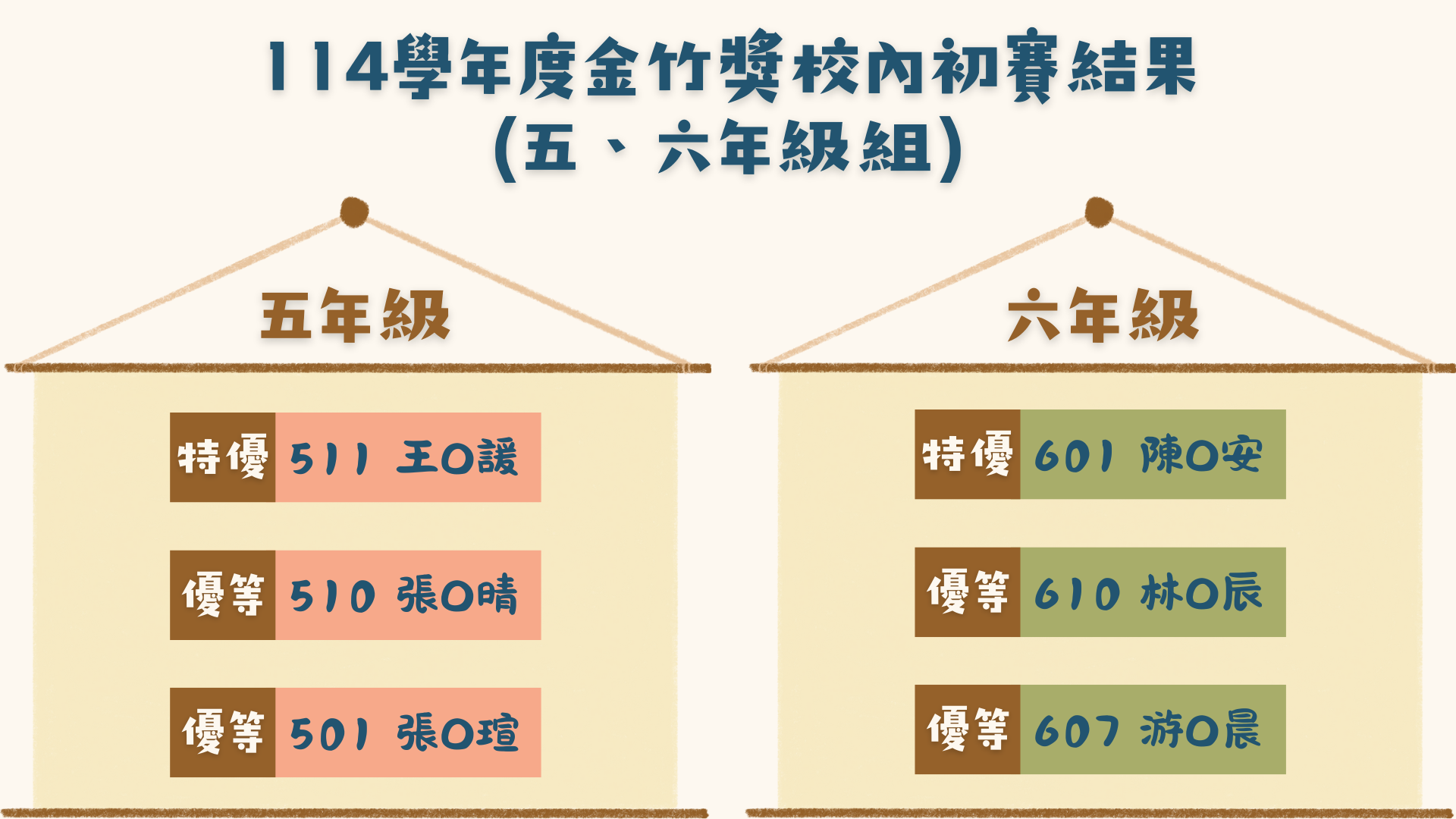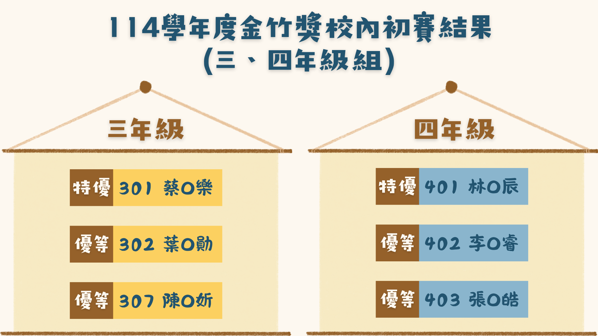 114學年度金竹獎英語朗讀比賽校內初賽得獎名單