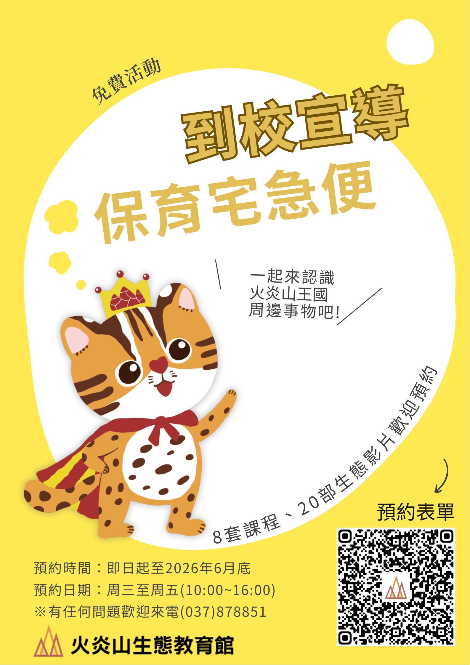 | 三、 | 檢附「保育宅急便」校園宣導海報、課程預約申請單1份、影片預約申請單1份、課程簡介、影片簡介,本活動預約時間為每週三至週五上午10:00至下午4:00,相關活動資訊歡迎直接洽詢本分署火炎山生態教育館(037-878851)辦理。 |