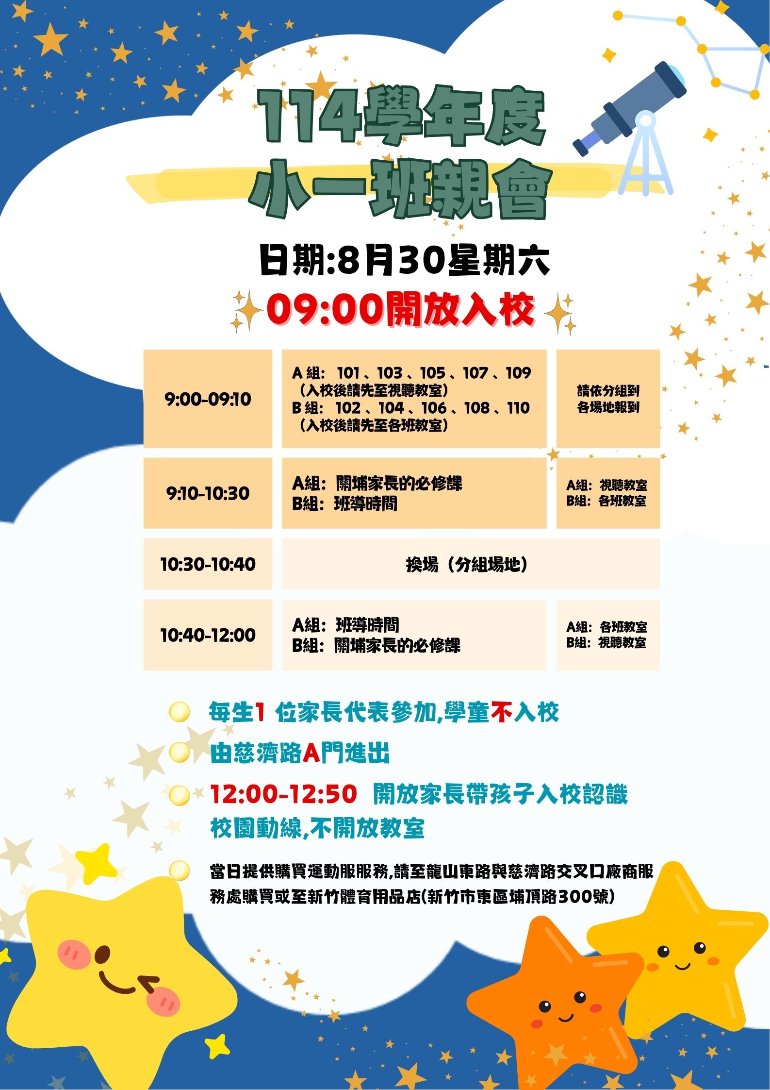 三、當日9:00~12:00不開放學童與一般民眾入校,12:00-12:50校園開放供新生家長帶孩子入校認識校園動線