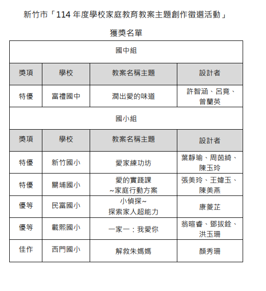 恭賀本校張美玲老師、王媁玉老師、 陳美燕老師榮獲家庭教育教案主題創作徵選特優!!