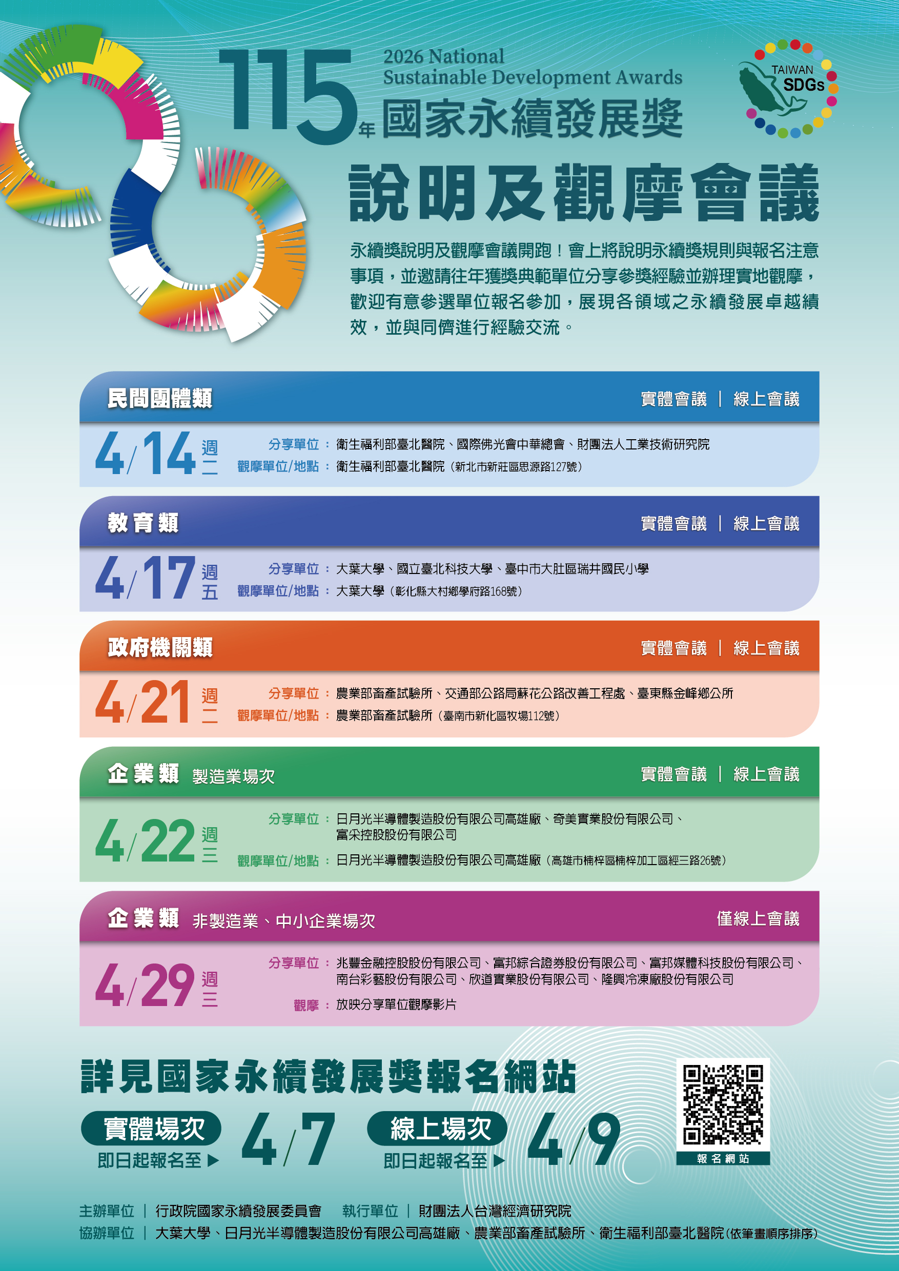 | 二、 | 為增進各界對於國家永續發展獎之瞭解,並促進永續發展相關經驗互相交流與分享,該會另舉辦「115年國家永續發展獎說明及觀摩會議」共計5場次,均可免費線上報名,歡迎有意參加本年度國家永續發展獎選拔者踴躍參加,活動資訊請參考附件2、3,活動資訊網址:https://gov.tw/XST)。 |