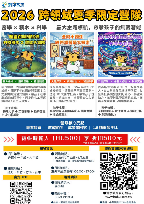 | 一、 為推廣兒童STEAM(科學、技術、工程、藝術、數學)跨領域教育,本會於2026年暑期舉辦系列主題營隊,透過「實作導向」教學,培養學童解決問題之能力與創造力。 |